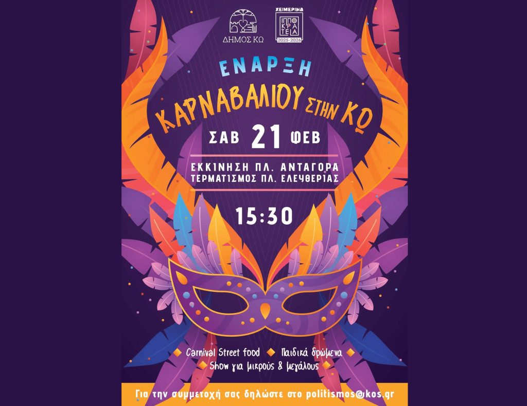 Σε αποκριάτικους ρυθμούς μπαίνει η Κως, καθώς το Τμήμα Πολιτισμού του Δήμος Κω απευθύνει ανοιχτό κάλεσμα συμμετοχής για το Καρναβάλι της πόλης, που θα πραγματοποιηθεί το Σάββατο 21 Φεβρουαρίου 2026 με ώρα έναρξης 15:30. Η παρέλαση θα ξεκινήσει από την Πλατεία Ανταγόρα και θα ολοκληρωθεί στην Πλατεία Ελευθερίας, όπου θα συνεχιστεί η γιορτή με μουσική, χορό και εκδηλώσεις για μικρούς και μεγάλους.