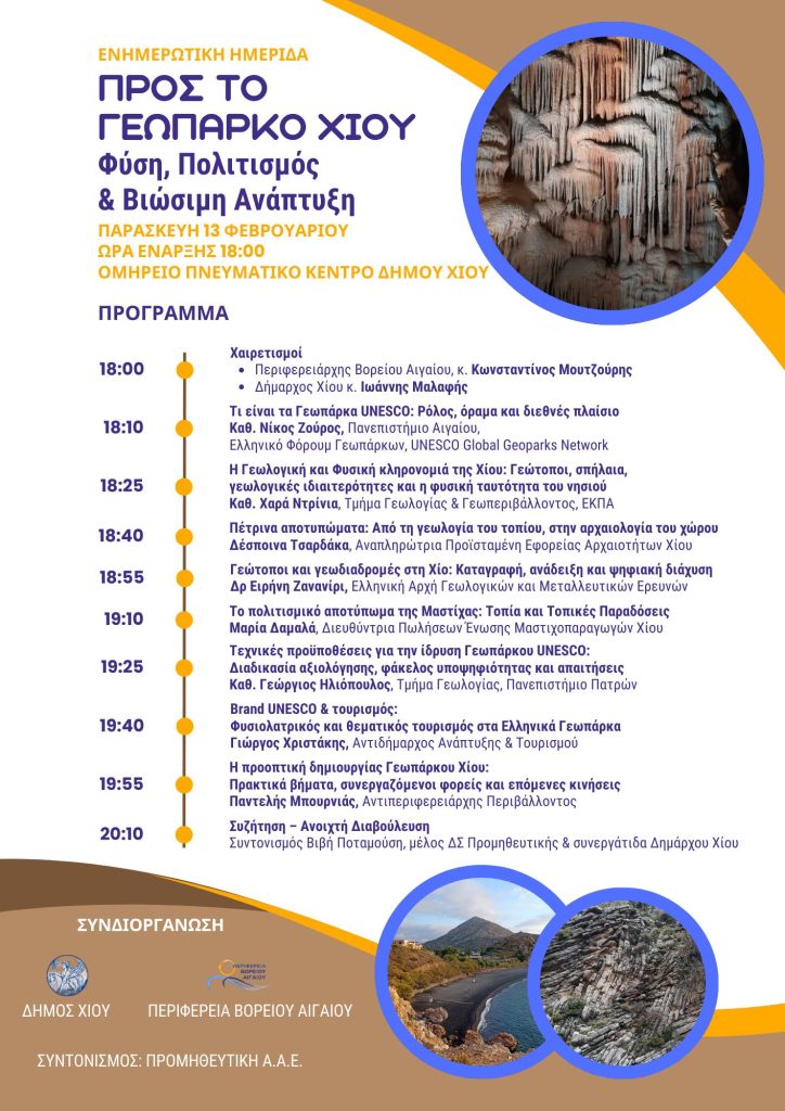 Ένα σημαντικό βήμα προς την ανάδειξη της γεωλογικής και πολιτιστικής κληρονομιάς της Χίου επιχειρείται με τη διοργάνωση ενημερωτικής ημερίδας με τίτλο «Προς το Γεωπάρκο Χίου: Φύση, Πολιτισμός & Βιώσιμη Ανάπτυξη», που θα πραγματοποιηθεί την Παρασκευή 13 Φεβρουαρίου 2026, από τις 18:00 έως τις 21:00, στην αίθουσα συνεδρίων του Ομήρειου Πνευματικού Κέντρου του Δήμος Χίου.