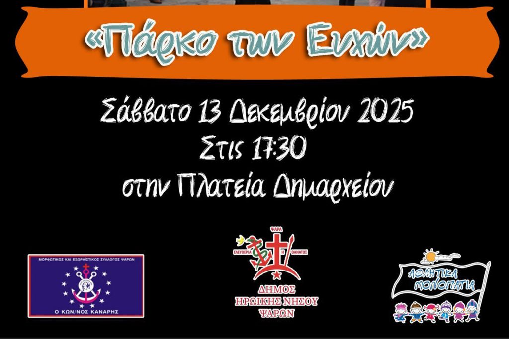 Στα Ψαρά, η καρδιά των Χριστουγέννων θα χτυπήσει ξανά δυνατά, καθώς ο Δήμος Ηρωικής Νήσου Ψαρών ανακοινώνει την επιστροφή του «Πάρκου των Ευχών» για δεύτερη συνεχή χρονιά. Το Σάββατο 13 Δεκεμβρίου, στις 17:30, η Πλατεία Δημαρχείου μεταμορφώνεται σε έναν λαμπερό, γιορτινό χώρο, γεμάτο φως, χαρά και ανεμελιά, προσκαλώντας μικρούς και μεγάλους να ζήσουν ένα απόγευμα βγαλμένο από παραμύθι.