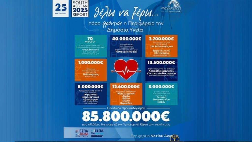 Μήνυμα με σαφές αποτύπωμα έργου και προτεραιοτήτων έστειλε ο Περιφερειάρχης Γιώργος Χατζημάρκος, παρουσιάζοντας τον απολογισμό των παρεμβάσεων στον τομέα της Υγείας για το 2025. Όπως επισημαίνει, πρόκειται για μια χρονιά-σταθμό για την Περιφέρεια Νοτίου Αιγαίου, με συνολικό πρόγραμμα ύψους 85,8 εκατομμυρίων ευρώ που θέτει τις βάσεις για ουσιαστική αναδιάρθρωση του υγειονομικού χάρτη των νησιών.