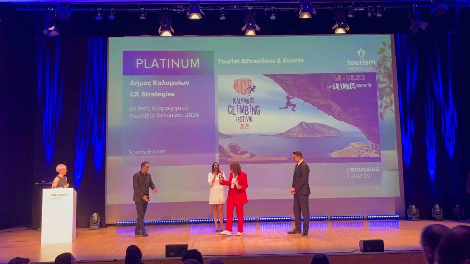 Διπλή διάκριση απέσπασε η Κάλυμνος στα Tourism Awards 2026,κατακτώντας Χρυσό και Πλατινένιο βραβείο στο Διεθνές Αναρριχητικό Φεστιβάλ 2025, επιβεβαιώνοντας τη δυναμική της παρουσία στη διεθνή σκηνή.