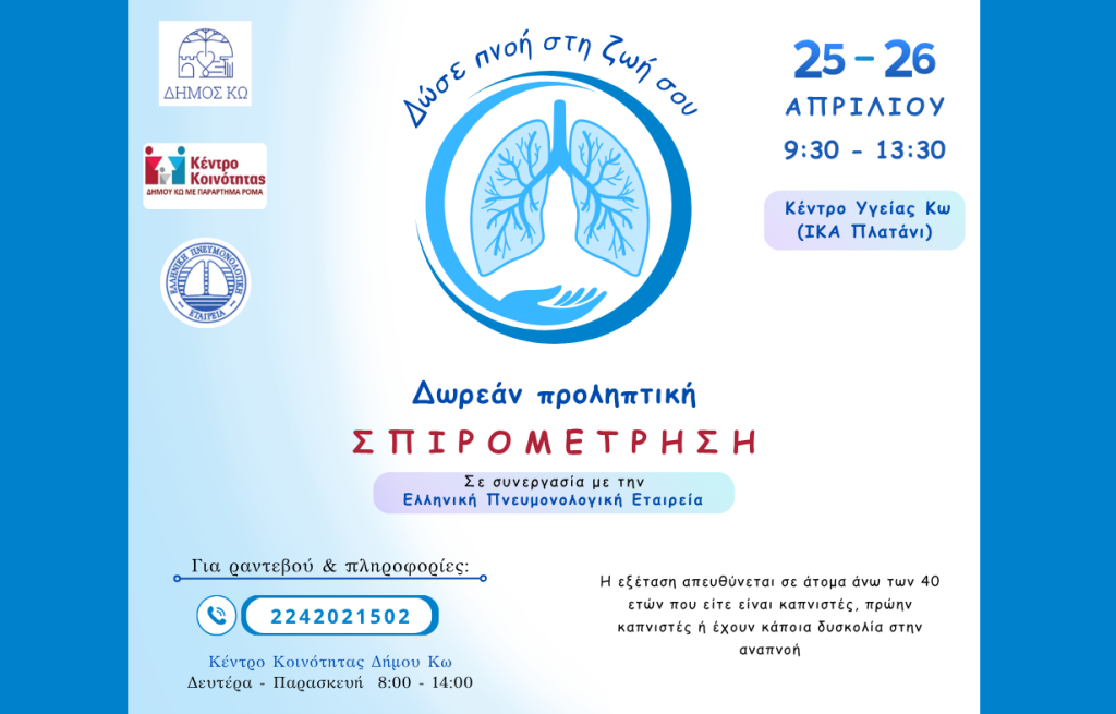 Το Κέντρο Κοινότητας Δήμου Κω, σε συνεργασία με την Ελληνική Πνευμονολογική Εταιρεία, θα υλοποιήσει δράση παροχής δωρεάν σπιρομετρήσεων με σκοπό τον προληπτικό έλεγχο της αναπνευστικής λειτουργίας, σε καπνιστές, πρώην καπνιστές ή άτομα με δυσκολία στην αναπνοή, άνω των 40 ετών.