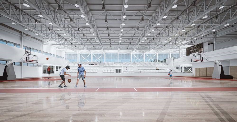 Επίσης ο αγωνιστικός χώρος σχεδιάζεται με τη δυνατότητα, ώστε προπονητικά, να μπορούν να λειτουργούν στον εγκάρσιο άξονα ταυτόχρονα δύο γήπεδα πετοσφαίρισης και καλαθοσφαίρισης, μέσω της σύμπτυξης τμήματος των κερκίδων.