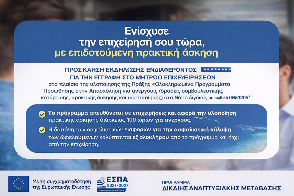 Σε πλήρη εξέλιξη βρίσκεται το πρόγραμμα «Ολοκληρωμένα Προγράμματα Προώθησης στην Απασχόληση για ανέργους στο Νότιο Αιγαίο», δίνοντας σημαντικές δυνατότητες τόσο σε επιχειρήσεις όσο και σε ανέργους της περιοχής να ενισχύσουν τη θέση τους στην αγορά εργασίας.