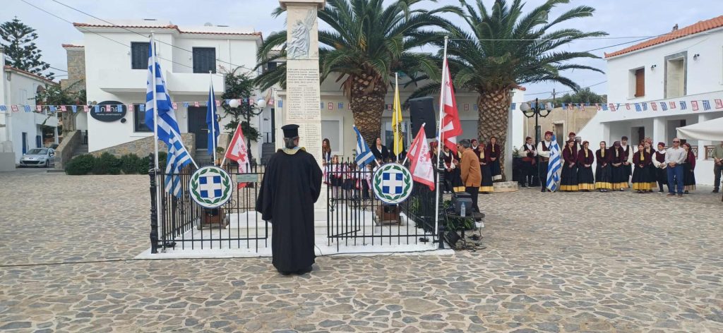 Ακολούθησε η μαθητική παρέλαση κατά μήκος της παραλιακής οδού, με τα παιδιά του νησιού να παρελαύνουν περήφανα, γεμίζοντας με συγκίνηση τους παρευρισκόμενους. Στην Πλατεία Ηρώων Ολοκαυτώματος πραγματοποιήθηκε επιμνημόσυνη δέηση και κατάθεση στεφάνων από τις αρχές και τους φορείς, ενώ τηρήθηκε ενός λεπτού σιγή στη μνήμη των πεσόντων.