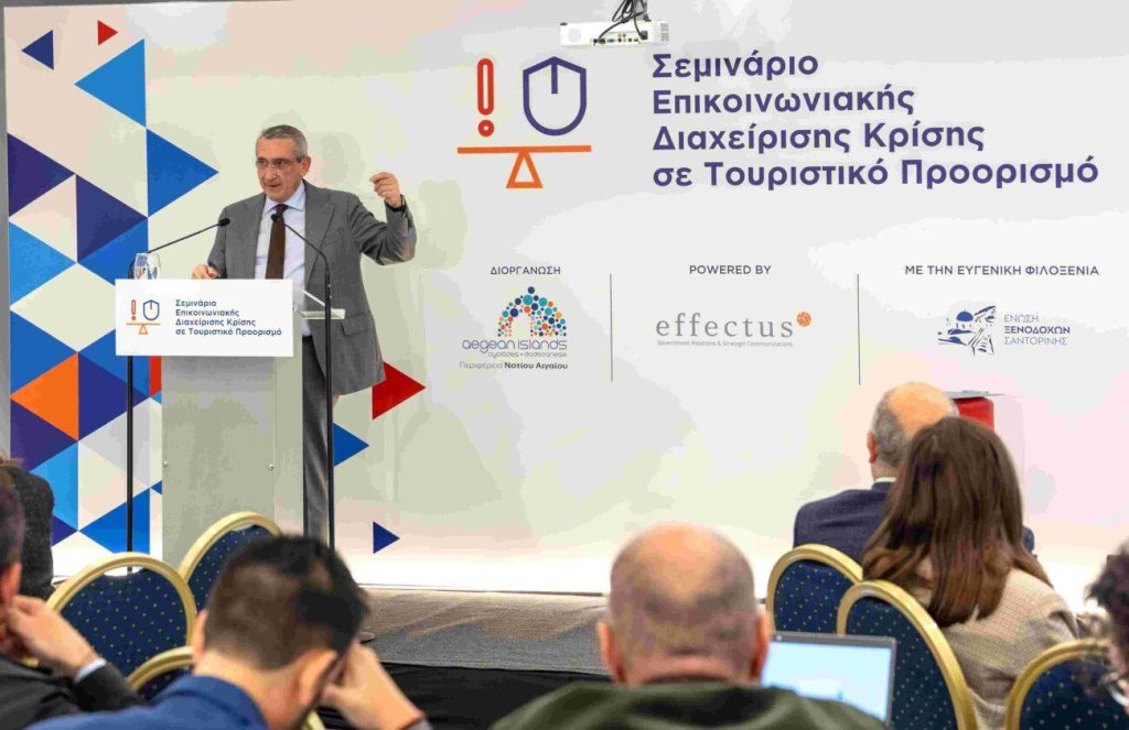 «Η θωράκιση της ανθεκτικότητας και της φήμης των νησιών μας έναντι απειλών που μπορεί να προκύψουν από μια ενδεχόμενη κρίση ή άλλο απρόβλεπτο γεγονός, είναι στρατηγική προτεραιότητα της Περιφέρειας Νοτίου Αιγαίου. Όλα τα τελευταία χρόνια κληθήκαμε να διαχειριστούμε διαδοχικές μεγάλες κρίσεις και όλες επιβεβαίωσαν πως εξίσου σημαντική με την επιχειρησιακή διαχείριση στο πεδίο, είναι και η επικοινωνιακή διαχείριση, τόσο μέσω των ΜΜΕ όσο και από τα μέσα κοινωνικής δικτύωσης. Η φήμη των νησιών μας είναι το πιο πολύτιμο περιουσιακό στοιχείο τους και δεν αφήνουμε τίποτα στην τύχη του. Η σωστή προετοιμασία, το λεπτομερές σχέδιο και οι ρόλοι ευθύνης είναι που κάνουν τη διαφορά σε μια δύσκολη ώρα και είναι τα χαρακτηριστικά που χτίζουν την εμπιστοσύνη, όπως ανέδειξε το Σεμινάριο εκπαίδευσης που πραγματοποιήσαμε. Ευχαριστώ θερμά το ΞΕΕ για τη συνεργασία μας, τον Δήμο Θήρας για τη φιλοξενία και την εταιρεία “effectus”, η οποία είχε την ευθύνη της εκπαίδευσης. Όταν ενώνονται ιδέες και δυνάμεις το αποτέλεσμα έχει πάντα αξία και όφελος για όλους».