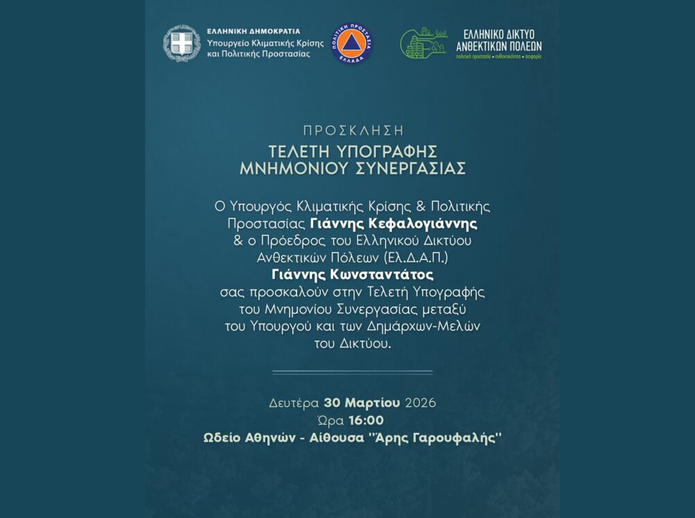 Ο Υπουργός Κλιματικής Κρίσης και Πολιτικής Προστασίας κ. Γιάννης Κεφαλογιάννης και ο Πρόεδρος Δ.Σ. του Ελληνικού Δικτύου Ανθεκτικών Πόλεων κ. Γιάννης Κωνσταντάτος σας προσκαλούν στην τελετή υπογραφής του Μνημονίου Συνεργασίας μεταξύ του Υπουργείου Κλιματικής Κρίσης και Πολιτικής Προστασίας και του Ελληνικού Δικτύου Ανθεκτικών Πόλεων.