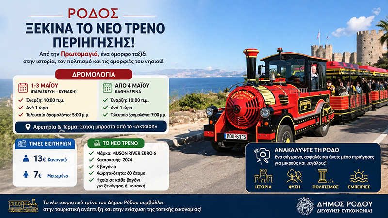 Σε λειτουργία τίθεται από την Παρασκευή 1 Μαΐου το νέο τρένο περιήγησης του Δήμου Ρόδου, εγκαινιάζοντας τη θερινή τουριστική περίοδο με ένα σύγχρονο μέσο ξενάγησης για κατοίκους και επισκέπτες.