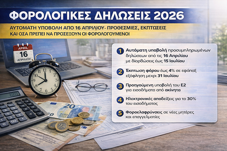 Σε πλήρη εξέλιξη τίθεται η διαδικασία υποβολής των φορολογικών δηλώσεων για το 2026, με τις προσυμπληρωμένες δηλώσεις να υποβάλλονται αυτόματα από τις 16 Απριλίου. Οι φορολογούμενοι καλούνται ωστόσο να ελέγξουν προσεκτικά τα στοιχεία πριν από την οριστικοποίηση, προκειμένου να αποφύγουν λάθη ή παραλείψεις.